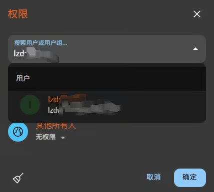 直接点击权限设置页面的搜索用户或用户组进行搜索对应用户并选择你要指定的对应用户/用户组